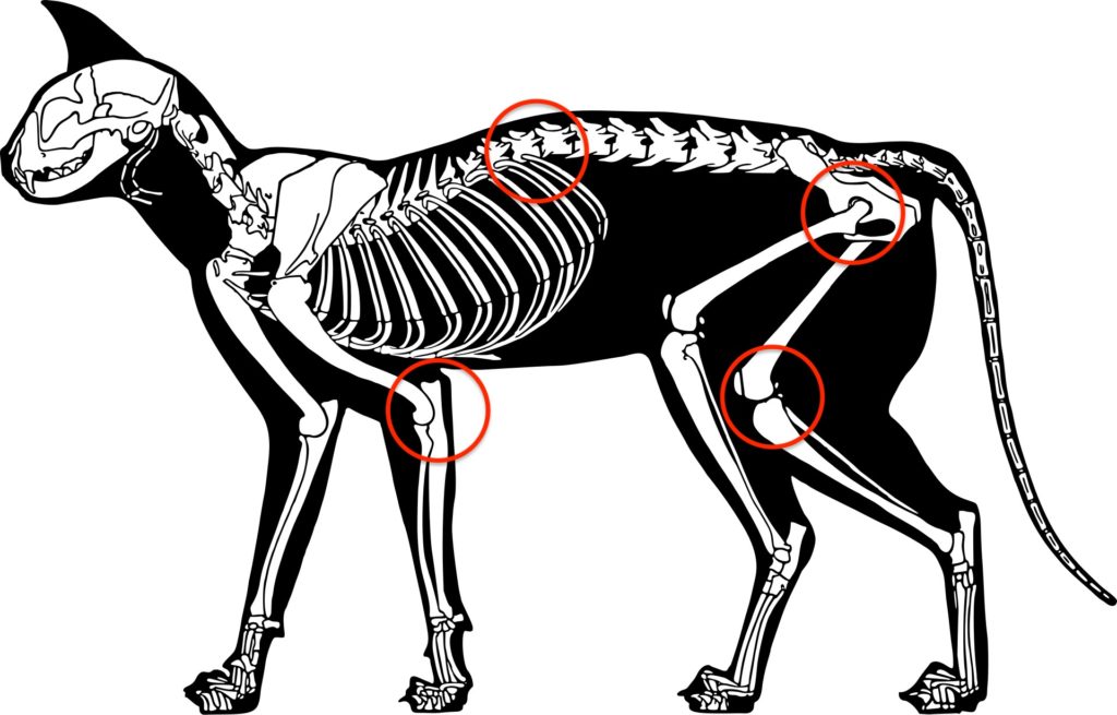 Les articulations sont souvent touchées des deux côtés (p.ex. les deux coudes), le chat ne montre donc généralement pas de boiterie d’une seule patte.